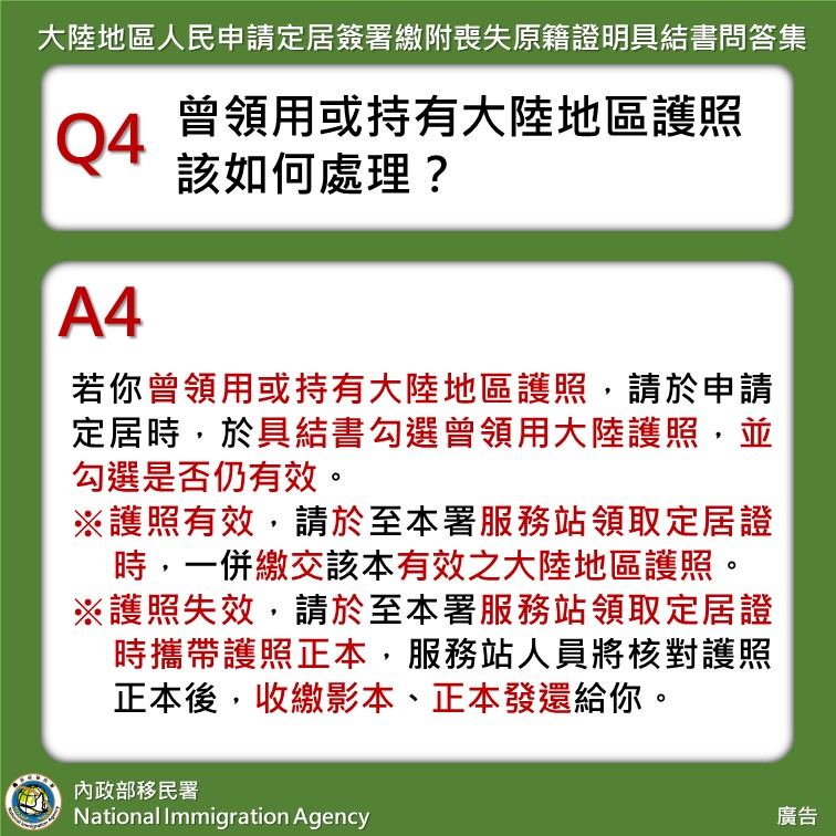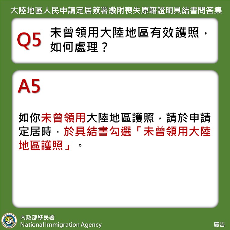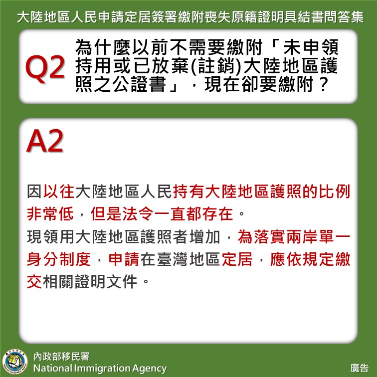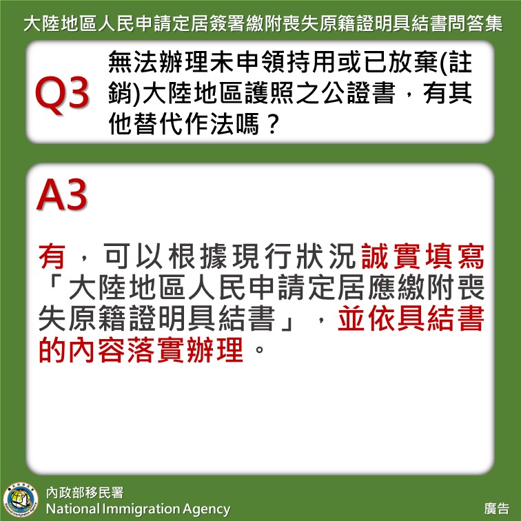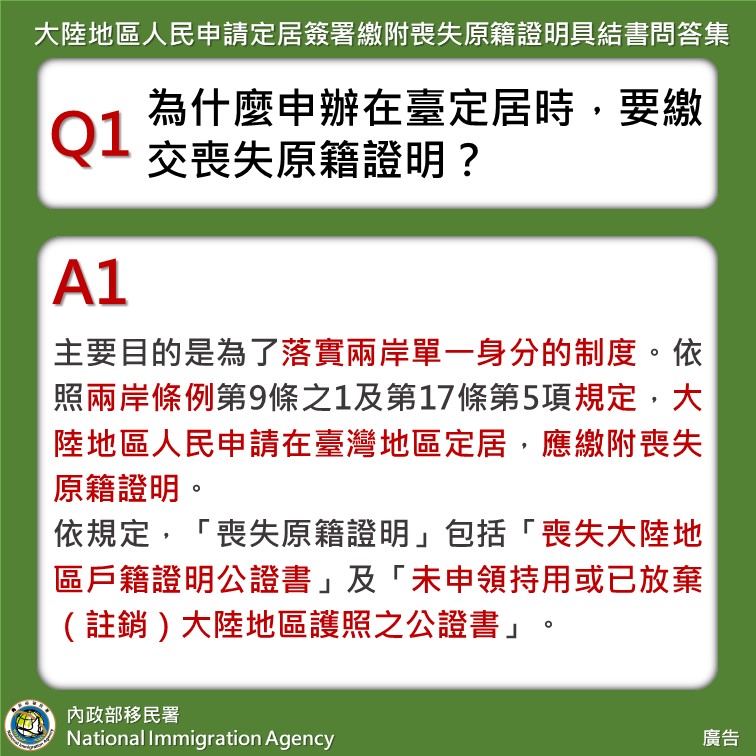 大陸地區人民申請定居簽署繳附喪失原籍證明具結書問答集