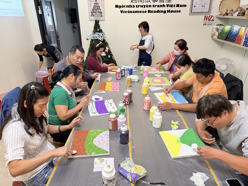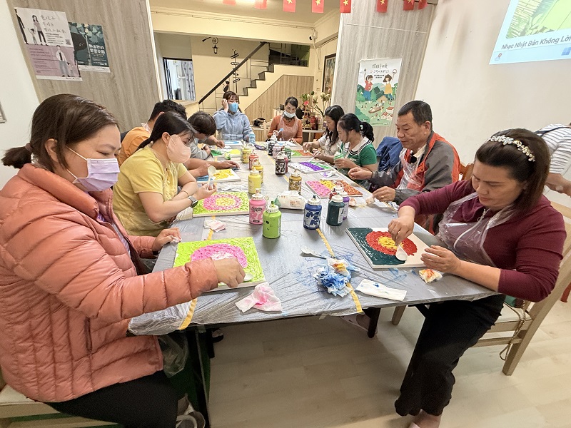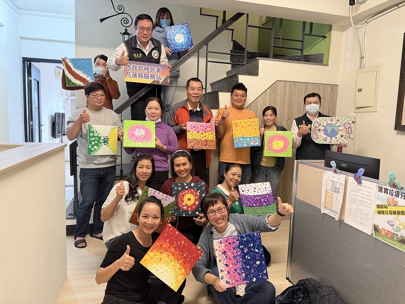 北區事務大隊花蓮縣服務站於114年12月5日辦理家庭教育課程,講師施慧凌帶領新住民姊妹們運用壓克力原料及生活日用品~湯匙,創作具創意又獨特的立體紋路肌理畫。新住民們透過顏料的堆疊,經過湯匙的拍擊和擠壓,讓顏料產生融合和暈染,講師希望透過創作過程,讓姊妹們理解,生活中充滿有各種可以「自造」的樂趣,不僅可以自娛娛人,更能透過「製造」的過程,增加生活裡的「我能感」。而顏料的融合與暈染,也象徵文化沒有侷限,「你融我融」才能創造合樂的家庭氛圍。除家庭教育外,本站加強說明新住民居(停)留相關法令規定、宣導反詐騙、1990專線的服務熱線、平板借用和免費電腦課程及自行到案罰鍰減半規定,請新住民們和其家人勿攜帶肉品入境,加強非洲豬瘟防範。