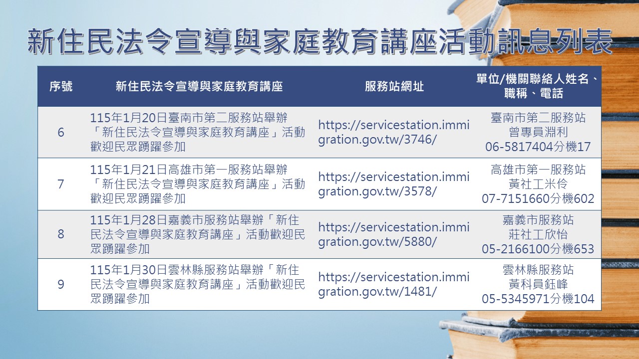 內政部移民署南區事務大隊舉辦115年1月份「新住民法令宣導與家庭教育講座」,歡迎民眾踴躍參加