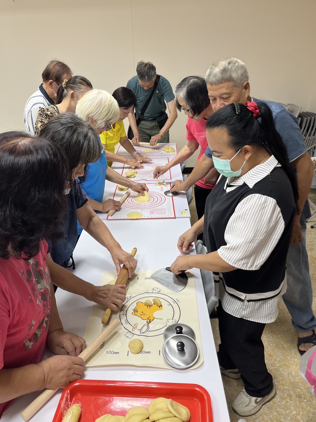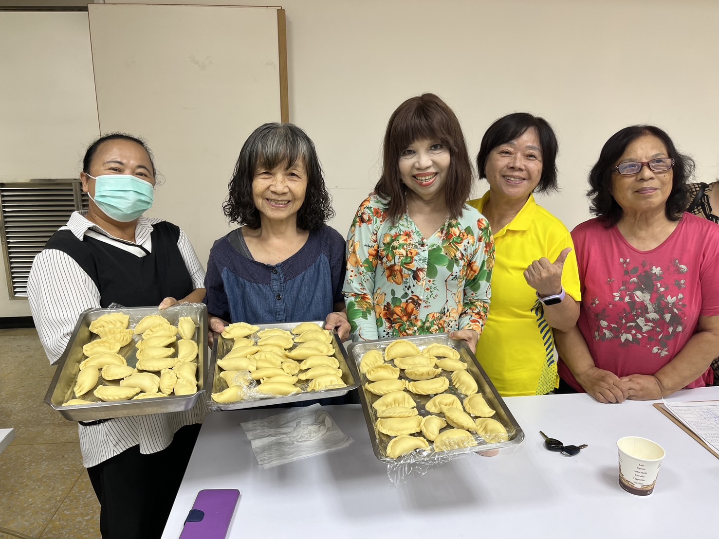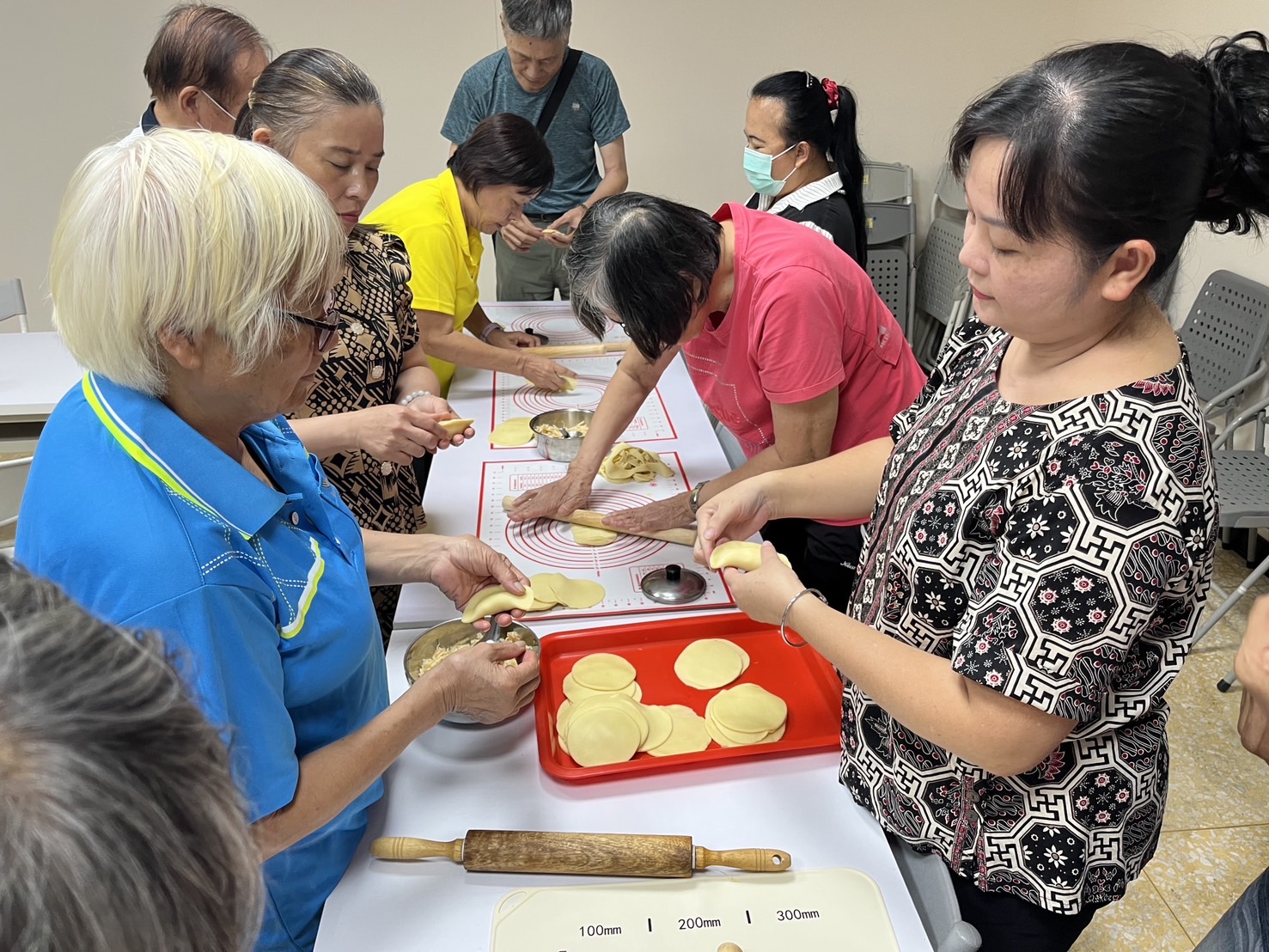 介紹完後,慧萍開始指導學員親手製作黃金餃,從擀麵皮、包餡料、對摺捏合、壓實、捏出摺痕,最後完成塑形,一連串的步驟在慧萍的示範下看似簡單,實際上每個步驟卻都蘊含許多技巧。在慧萍細心指導下,學員慢慢掌握了讓黃金餃外型漂亮的訣竅,讓大家相當有成就感。在經過下鍋油炸後,每顆黃金餃都呈現出金黃色的光澤,讓人看了垂涎欲滴,迫不及待地品嚐起自己親手製作的黃金餃。