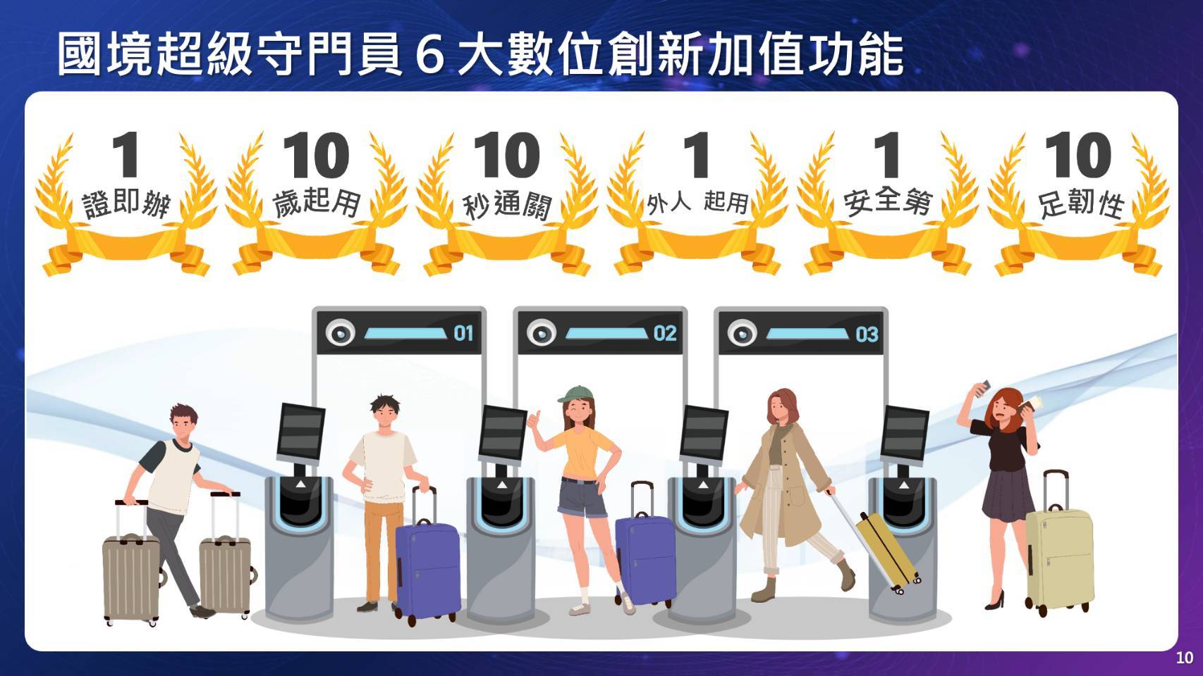 國家發展委員會於今(15)日舉辦行政院第8屆政府服務獎頒獎典禮,該獎素有公部門奧斯卡獎之美稱,需歷經初審及複審的激烈競爭及產、學、研界嚴謹的評審過程。內政部移民署以「智慧邊境,與世界更靠近」專案榮獲「數位創新加值」獎項,由移民署署長林宏恩及同仁赴典禮會場開心領獎。內政部說明,新世代e-Gate擁有「1證即辦」、「10歲起用」、「10秒通關」、「外人1起用」、「安全第1」及「10足韌性」等全新6大數位加值功能,移民署運用數位智慧升級系統效能,讓國人通關時間由平均12秒再優化至10秒,且外來旅客出境通關都可同步適用的功能,更讓通關時間從人工查驗45秒,大幅縮短至10秒,顯著提升便捷通關效能。另移民署2025年也榮獲「航空業奧斯卡獎」Skytrax「2025年最佳證照查驗服務機場(World’s Best Airport Immigration Service)」全球第4名的佳績,表示全世界旅客對移民署證照查驗服務有高度的肯定。