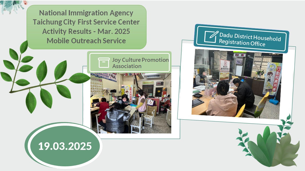 National Immigration Agency Taichung City First Service Center Activity Results- Mar. 2025 Mobile Outreach ServiceTime:2025/03/19 09:00-10:00 Location:Joy Culture Promotion Association